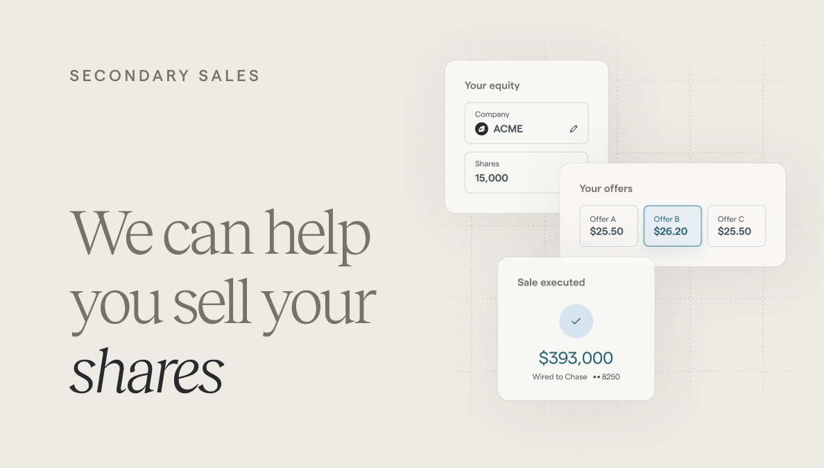Choosing between Financing and Secondaries depends on several factors, such as your desire to retain ownership of your shares, the availability of an active secondaries market for your company, your company's policies on ownership transfer, and whether you need funds to cover the exercise cost of your options. If you're unsure, our equity strategists can help you evaluate your options and make an informed decision.