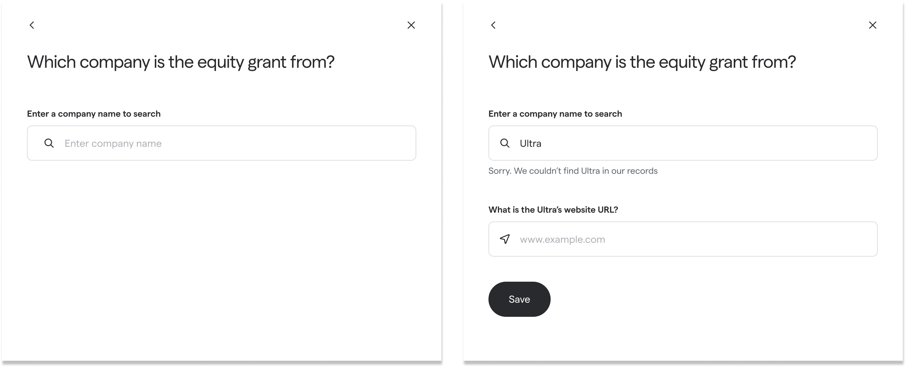 Search for and select the company that issued the equity grants. If the company isn't already in our records, you'll need to add the URL for your official website's homepage.