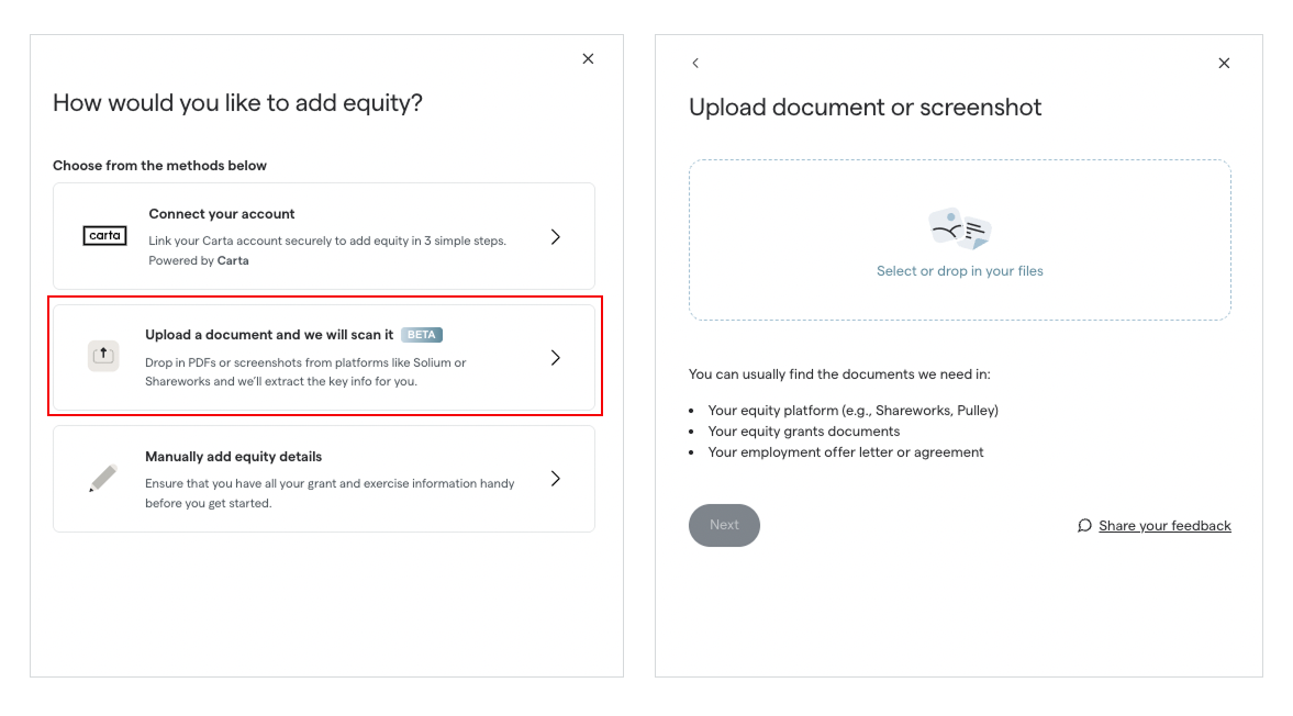 If your company uses Shareworks or other equity management platform, you can upload your equity or share documents and we will extract the relevant equity information. This is an easy way to have your equity data entered.