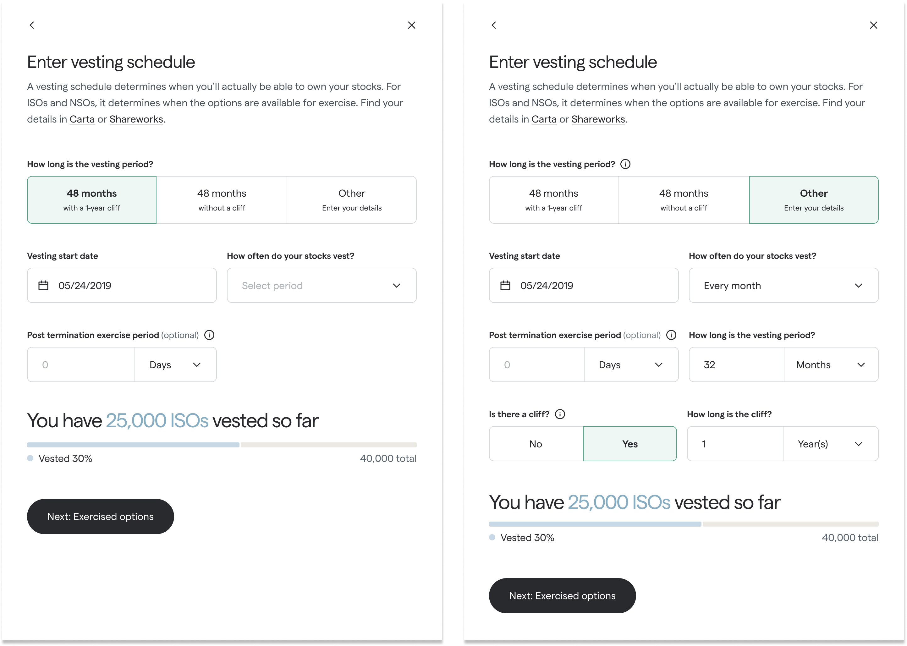 If you have exercised options from an ISO or NSO grant, you will be prompted to add those exercised options next. Otherwise, you can simply 'Save' your vesting details to finish adding the grant.