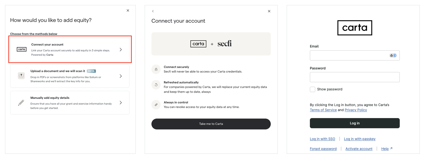 - It's safe: We use Carta APIs to enable secure login to your Carta account. This means that Secfi does not have access to your Carta credentials.