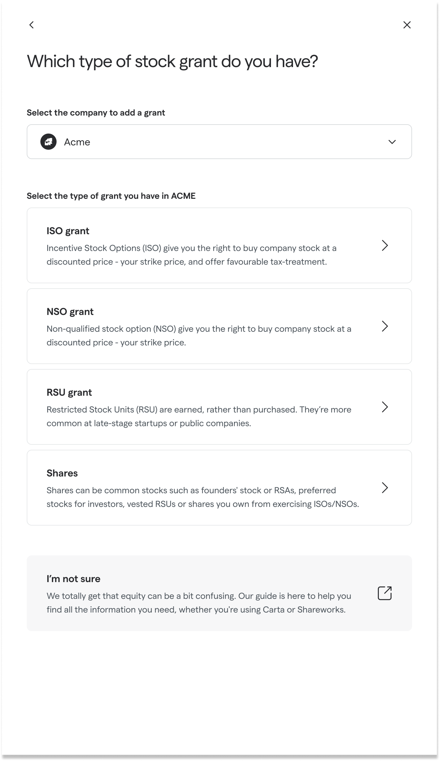 If your employer issued a share grant that is not linked to an ISO, NSO, or RSU grant or if you purchased stocks in a pre-IPO company through a secondary market transaction, please read the guide to adding shares.