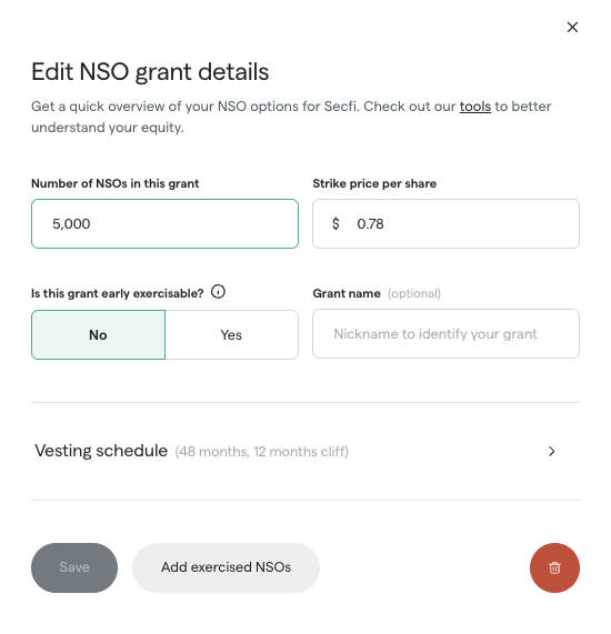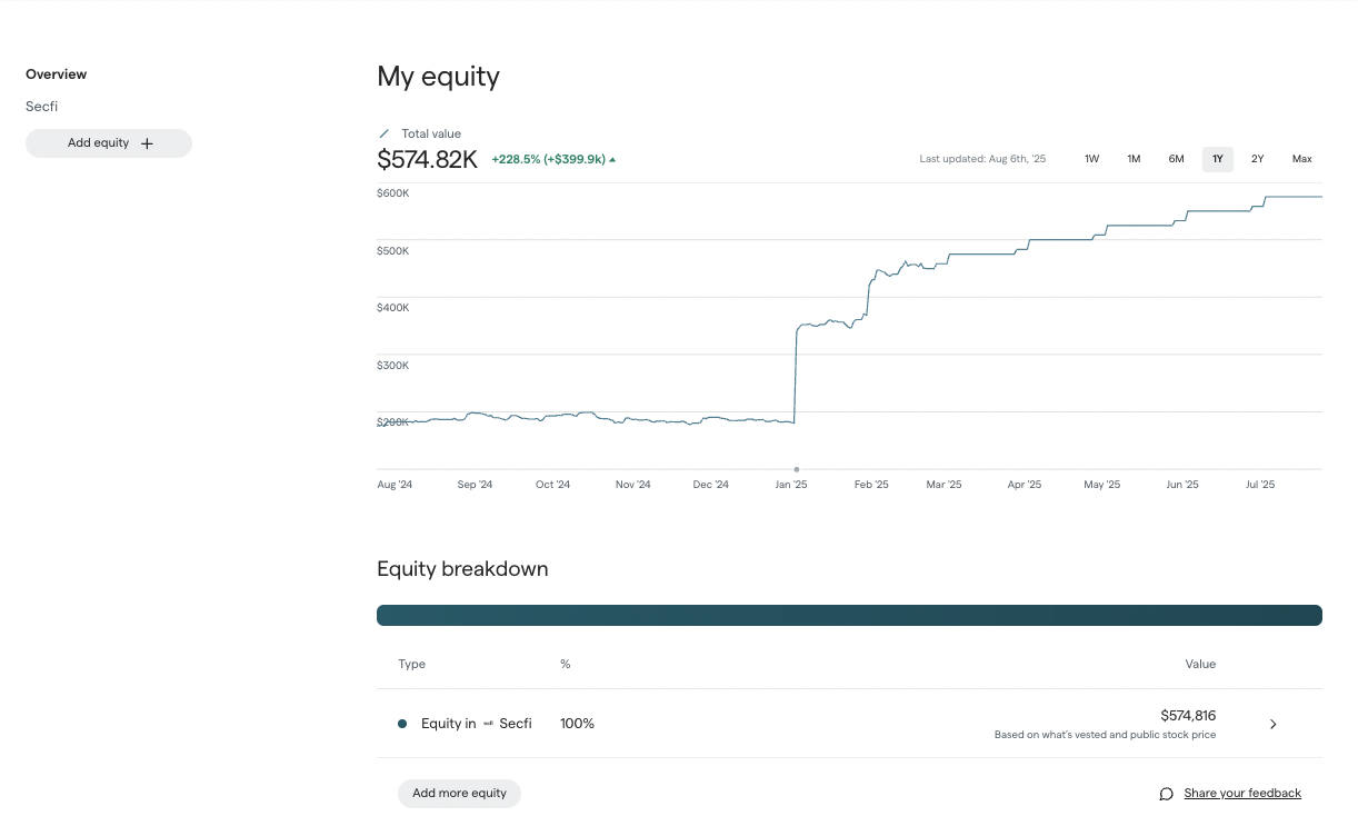 1. Once you are logged into Secfi, click "Equity". From there, you'll see the companies you've added equity for listed in the left hand menu or below the equity breakdown. Click into the company equity you're looking to update.