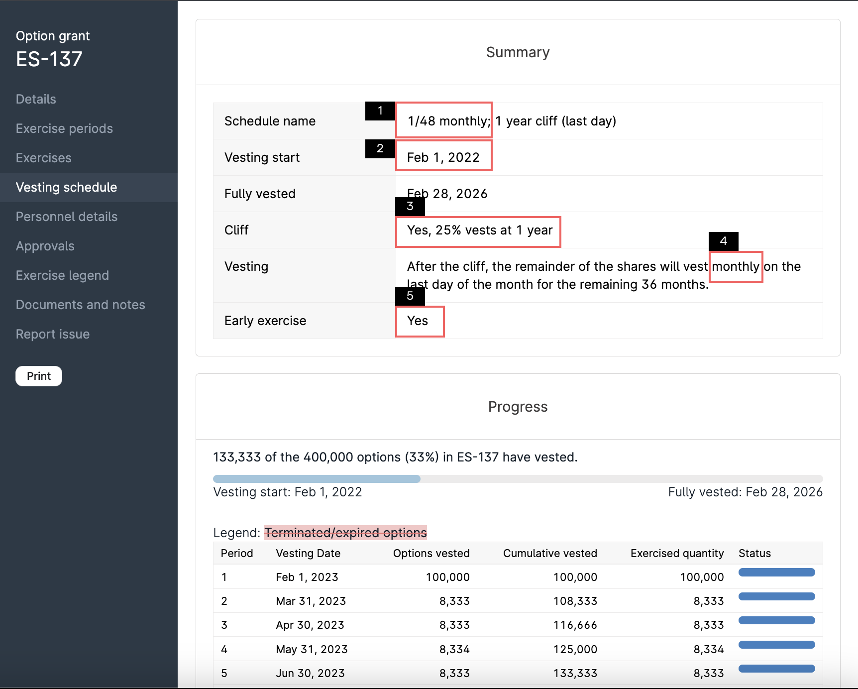 4. Vesting frequency: In the case of a cliff, this indicates how often your stocks vest after the cliff period.