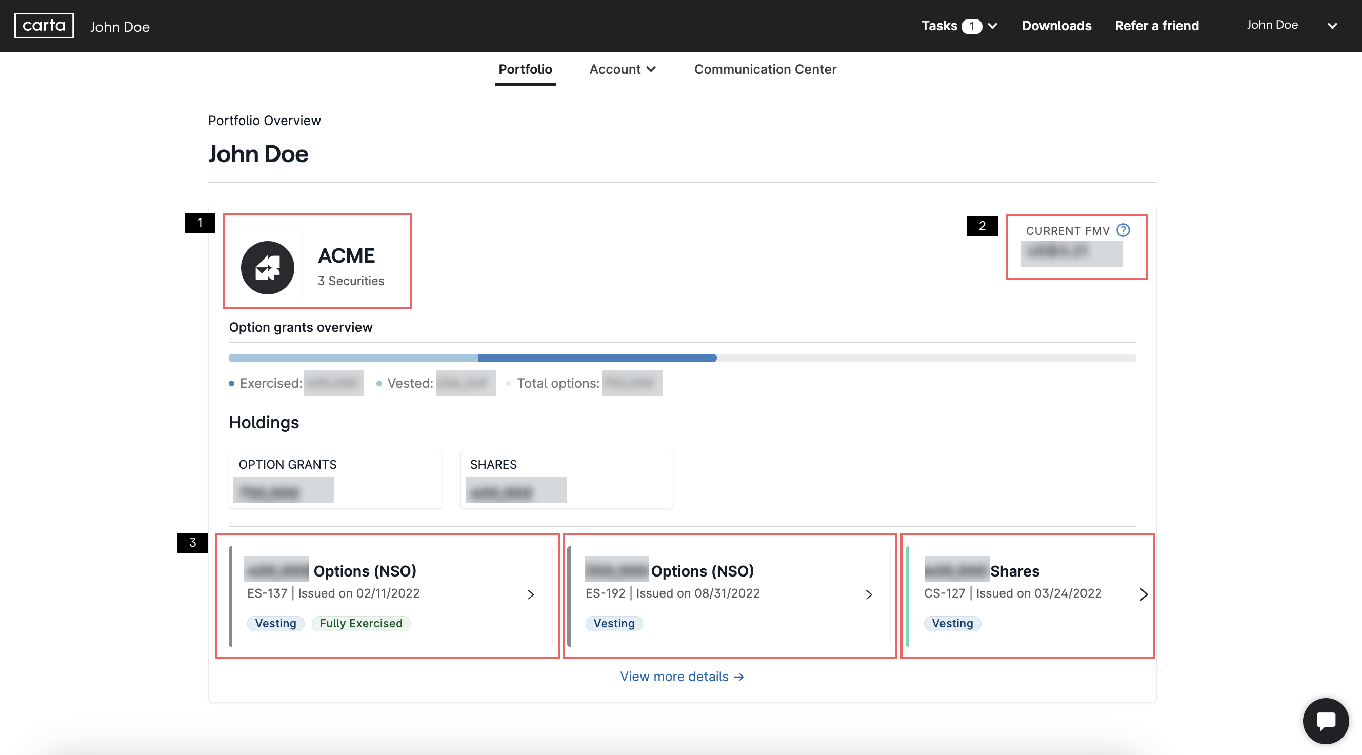 Once you log into your Carta account, you will be able to view your portfolio. If you have stock grants from multiple companies, scroll down to the company that you are trying to find the details of.