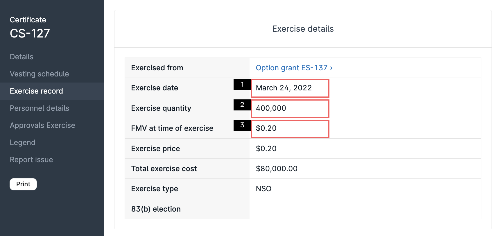 3. FMV on the date of exercise: This value is used to calculate taxes when selling exercised shares. In this scenario, the FMV when the options were exercised was $0.20.