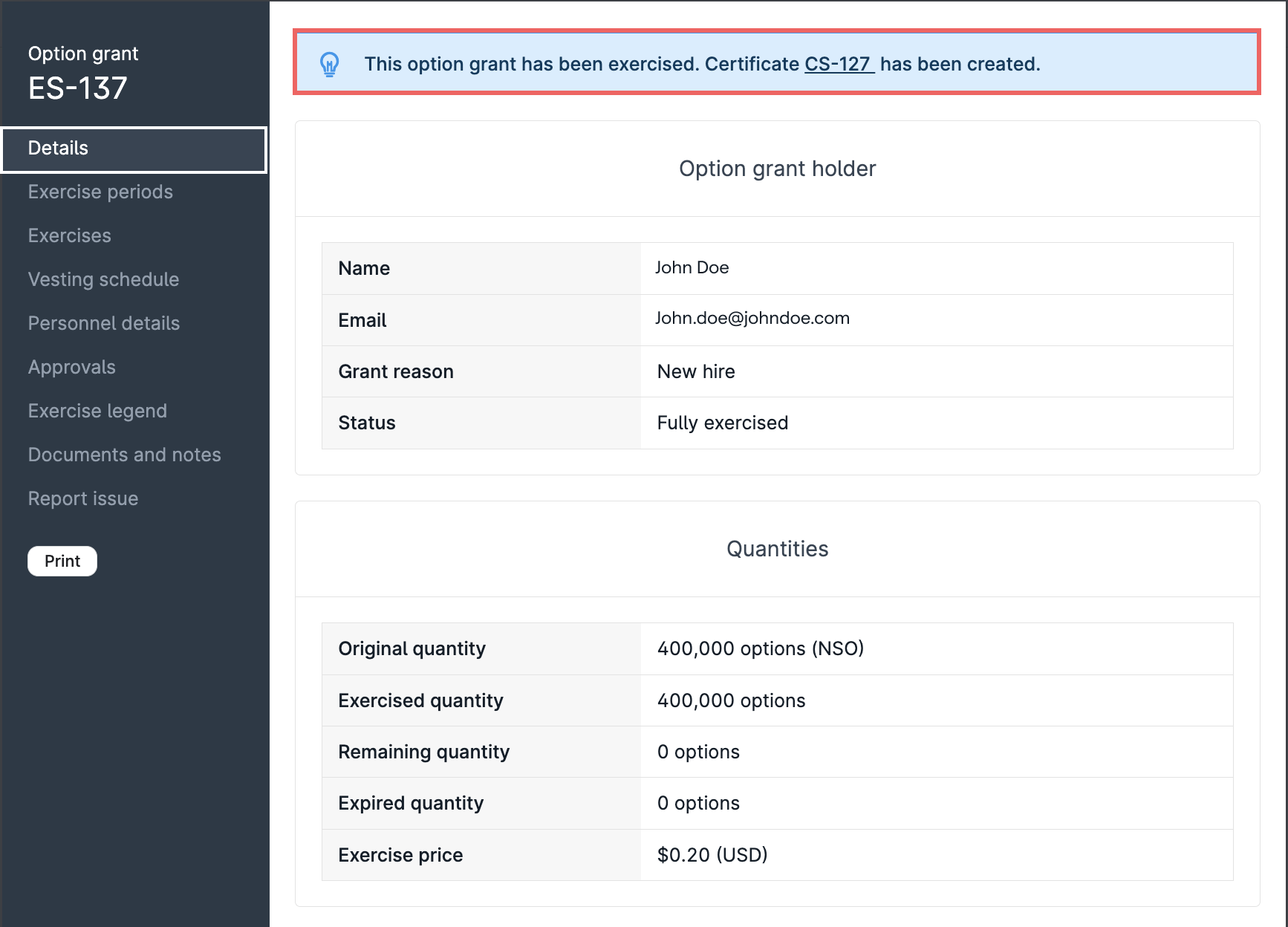2. Exercised options: If you have been issued an option grant (ISO or NSO) and you have exercised it, you will see a banner that links to your share certificate. Under the "Option grant holder" section, your "Status" will also show your option exercise status. The table below maps out the values and their meanings.