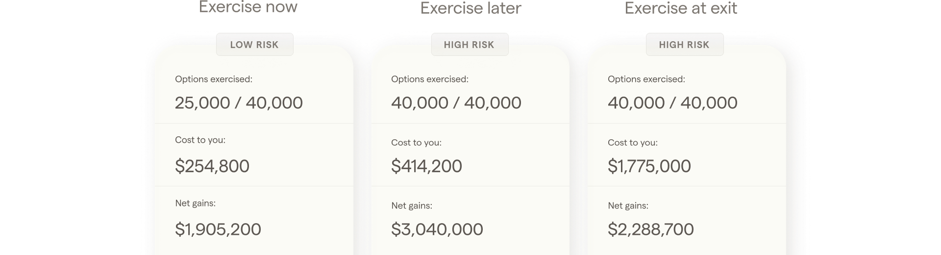 The biggest question we get from startup employees is “when should I exercise my options?” And the answer is usually, “it depends.” That’s because everyone’s equity and personal financial situation is different, as are their financial goals. But many don’t know where to start or even the different options available to them, let alone how to compare those options.